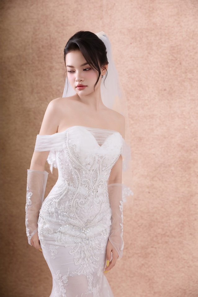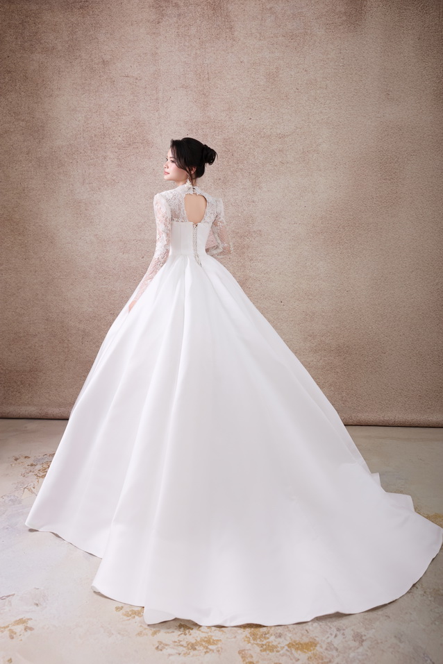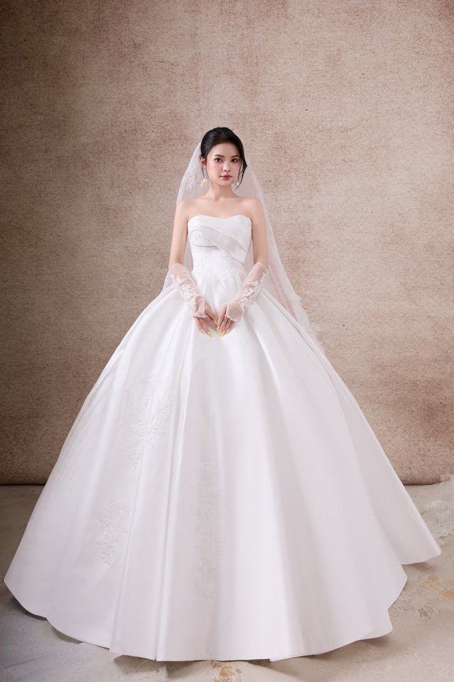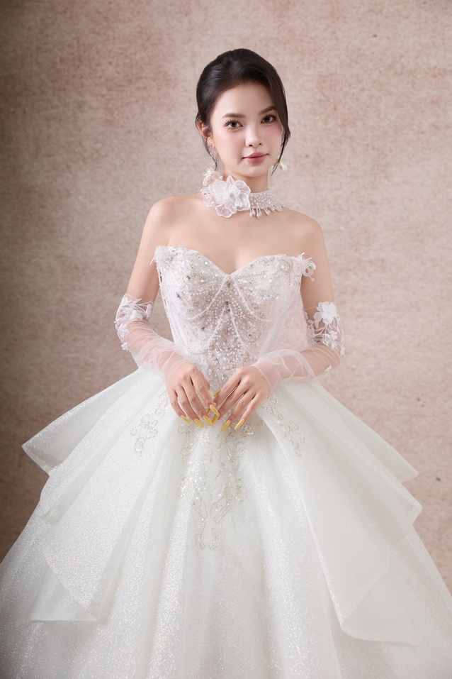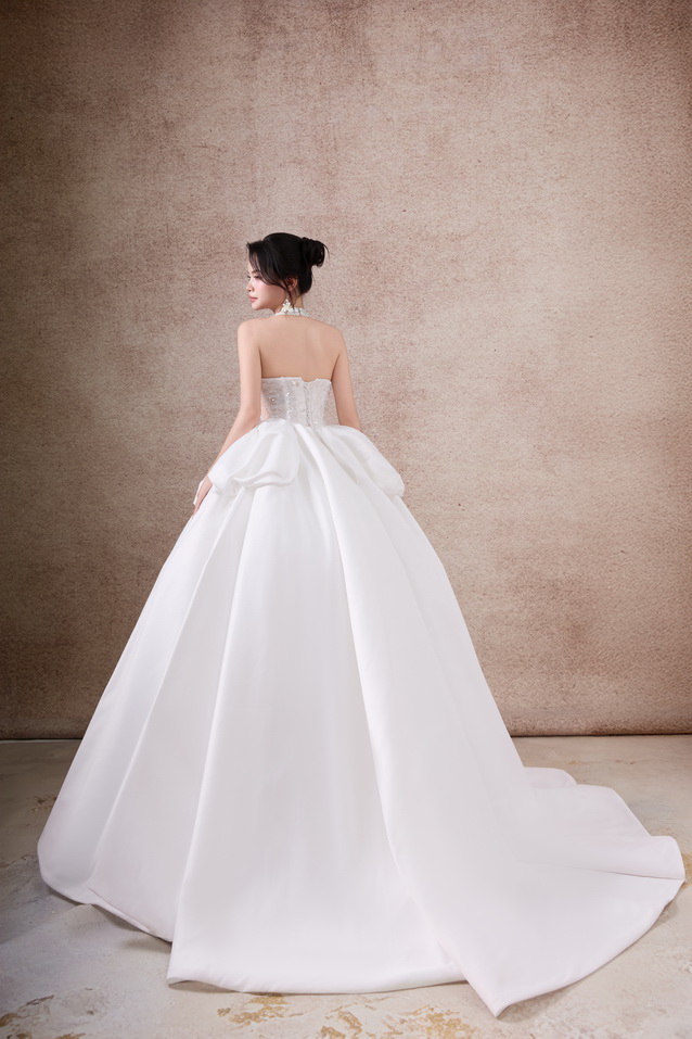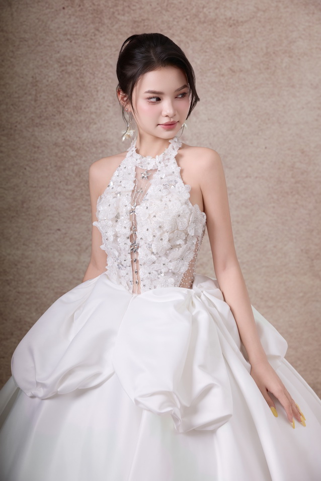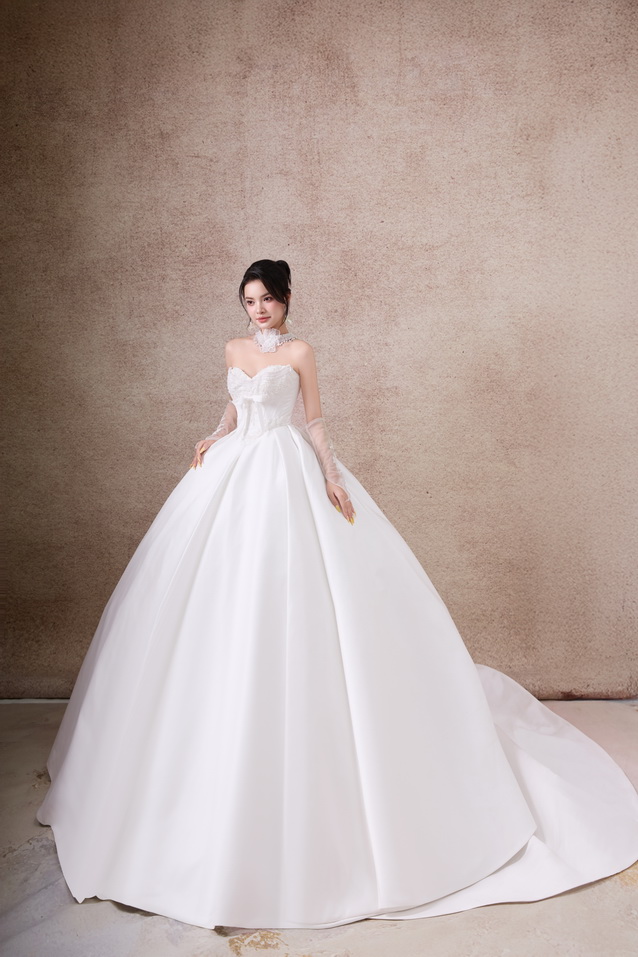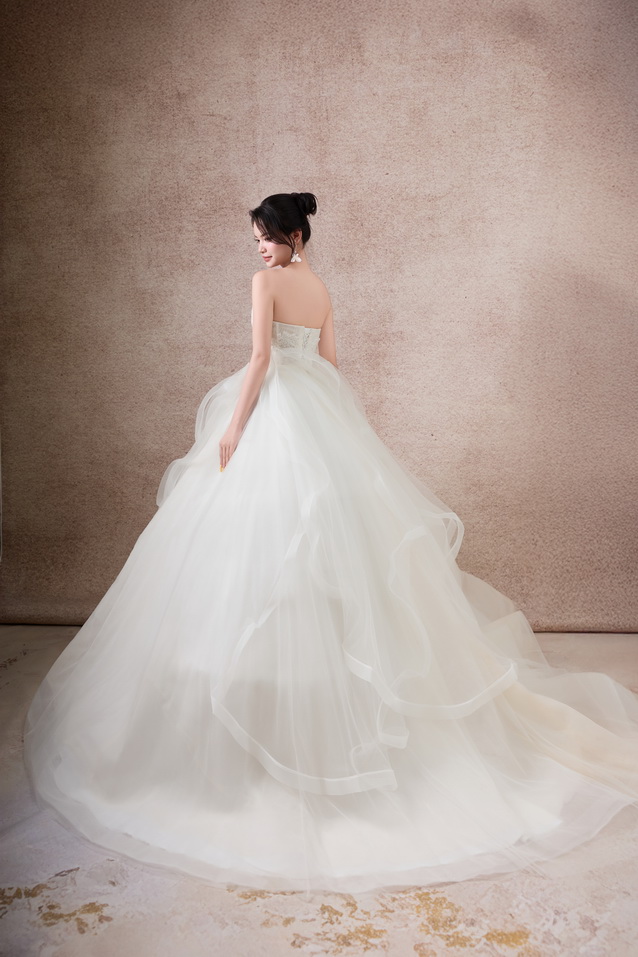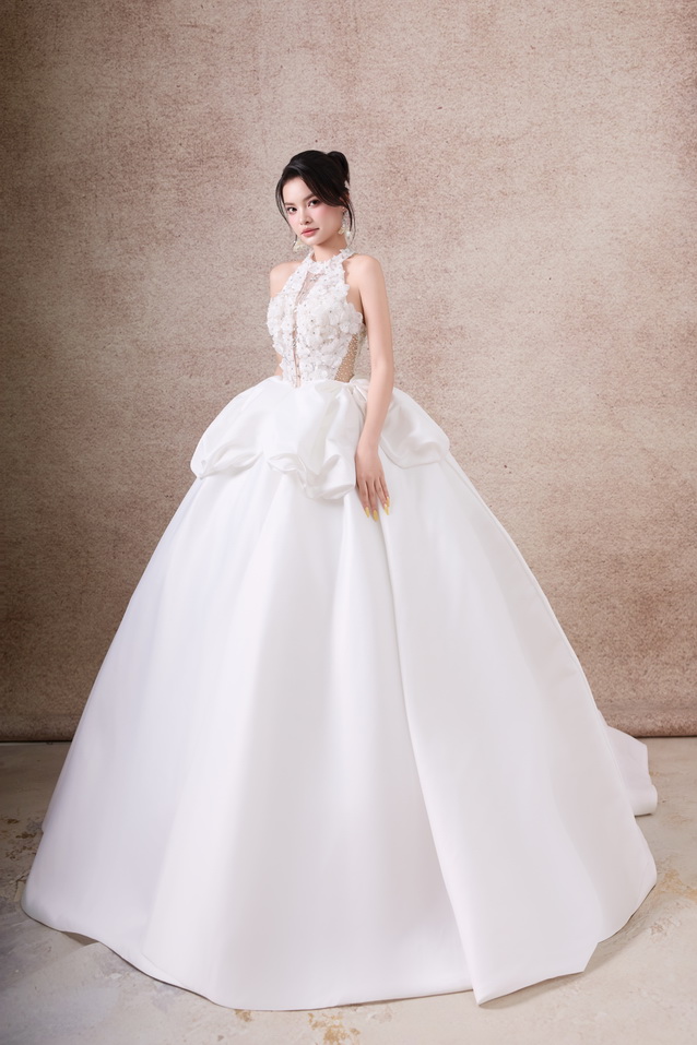Váy cưới dáng xoè luôn được xem là “nàng thơ bất diệt” trong thế giới váy cưới. Với phần thân trên ôm gọn tôn đường nét quyến rũ và chân váy bồng xoè nhẹ nhàng, bộ sưu tập lần này mang đến cho nàng dâu sự kết hợp hoàn hảo giữa sang trọng – lãng mạn – bay bổng.
