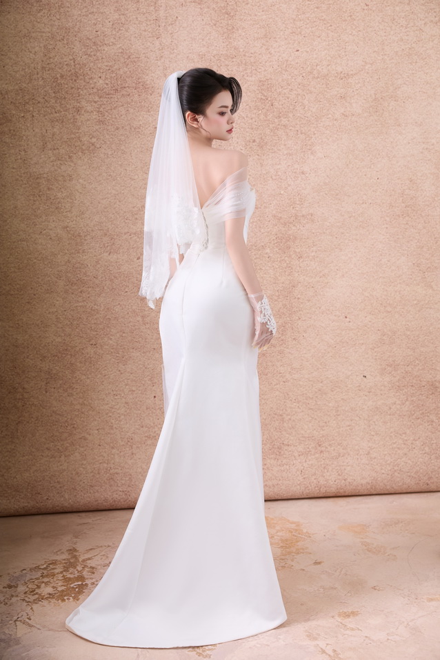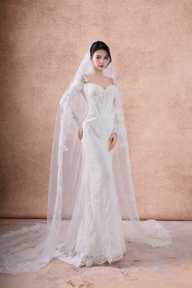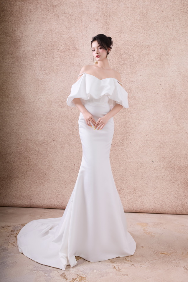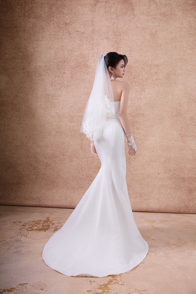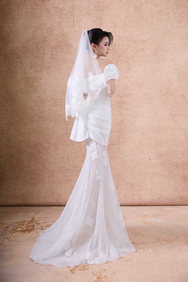 Nếu váy xoè mang lại nét ngọt ngào cổ tích thì váy cưới dáng đuôi cá chính là biểu tượng của sự quyến rũ và thanh thoát. Với thiết kế ôm sát cơ thể, tôn trọn đường cong mềm mại và phần tà váy xoè nhẹ nhàng phía sau, bộ sưu tập lần này đem đến hình ảnh nàng dâu vừa gợi cảm vừa lãng mạn.