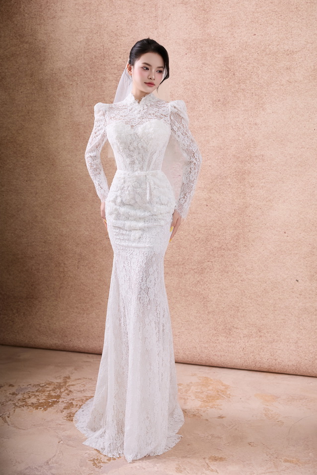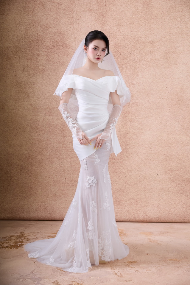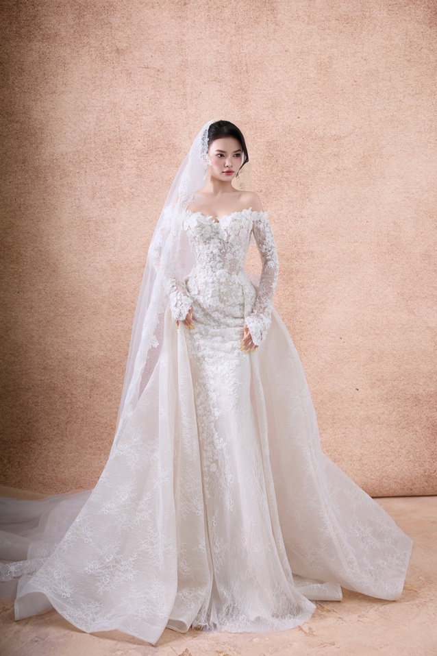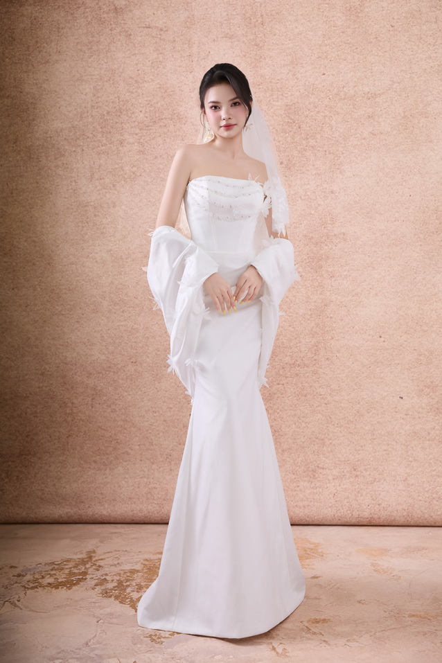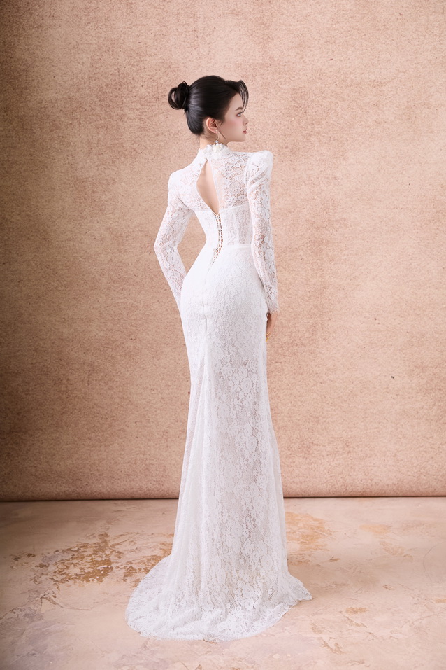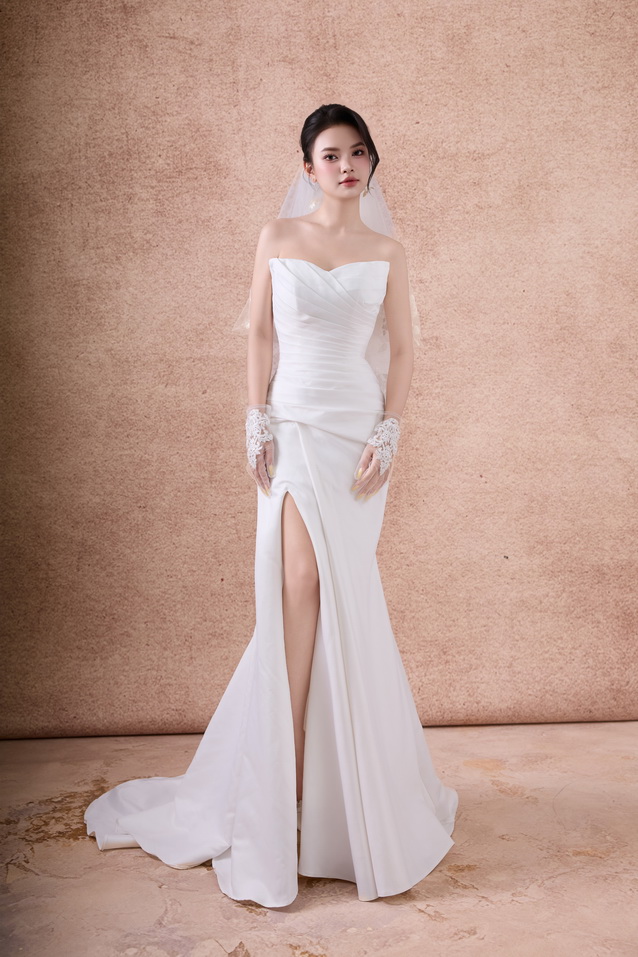 Nếu váy xoè mang lại nét ngọt ngào cổ tích thì váy cưới dáng đuôi cá chính là biểu tượng của sự quyến rũ và thanh thoát. Với thiết kế ôm sát cơ thể, tôn trọn đường cong mềm mại và phần tà váy xoè nhẹ nhàng phía sau, bộ sưu tập lần này đem đến hình ảnh nàng dâu vừa gợi cảm vừa lãng mạn.