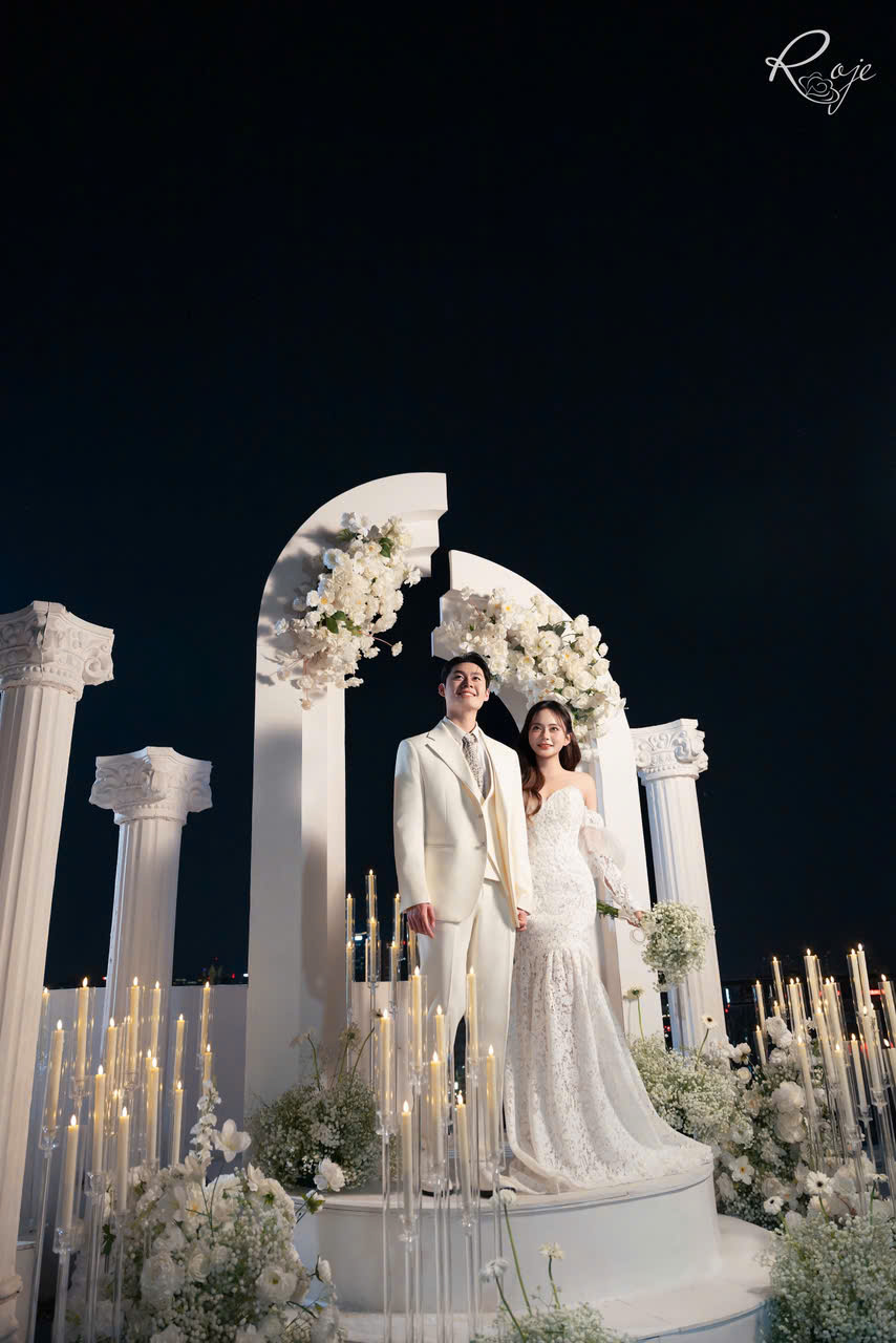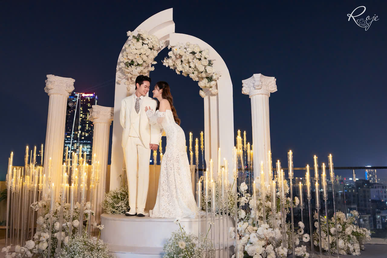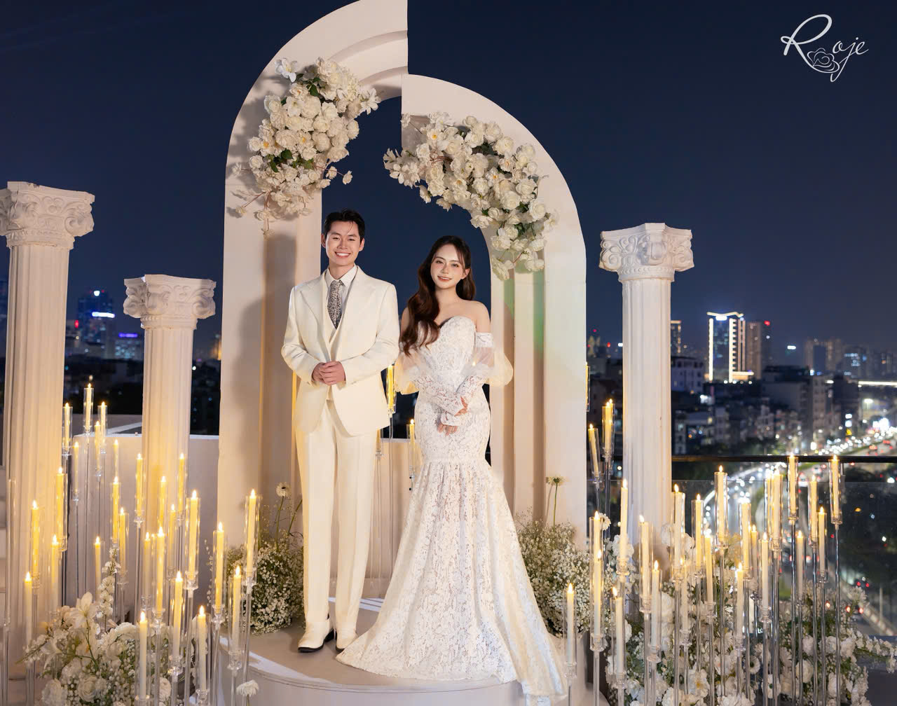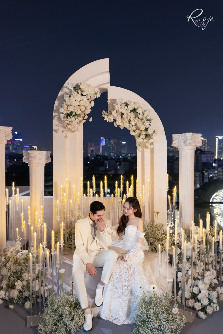 Ánh nến lung linh giữa không trung, background đêm sâu thẳm, hoa trắng tinh khôi và tình yêu của đôi mình