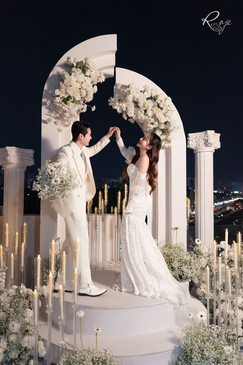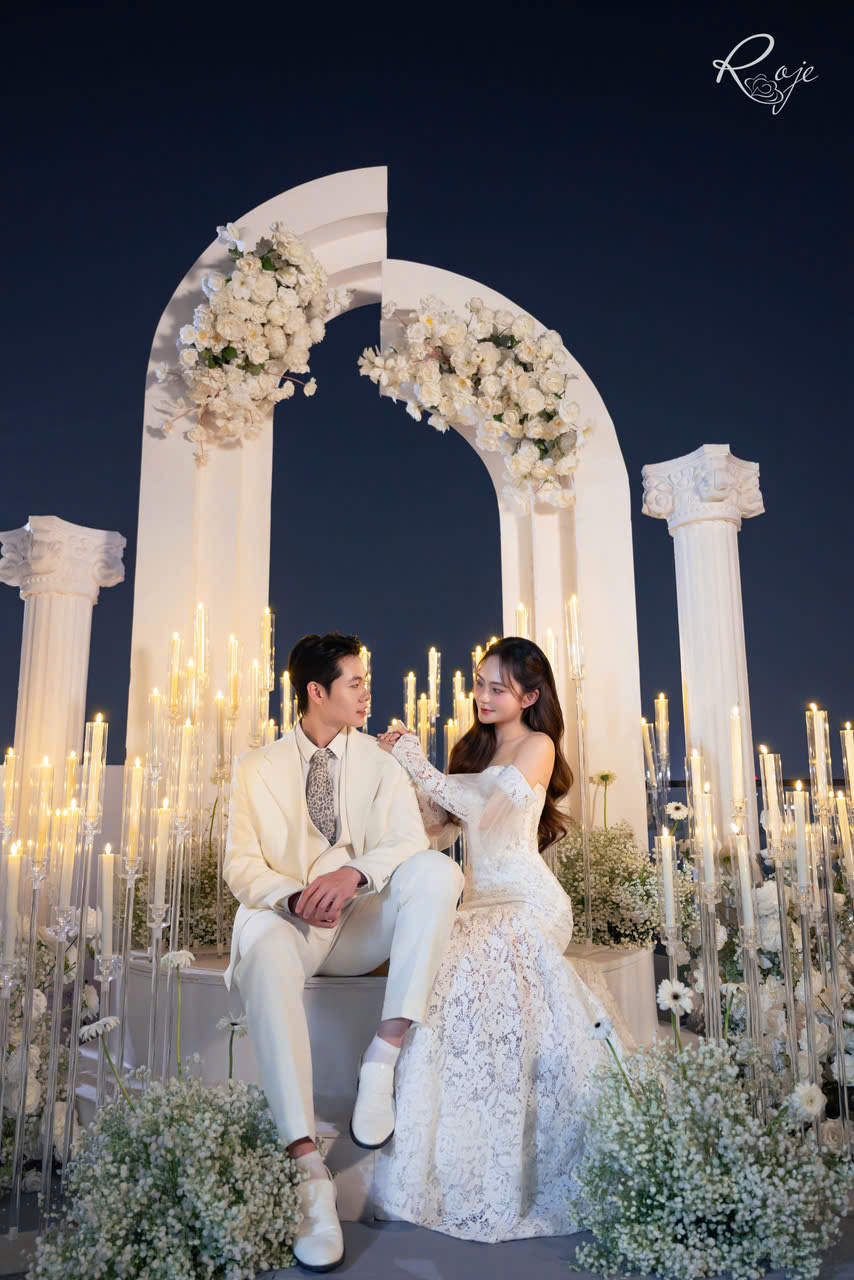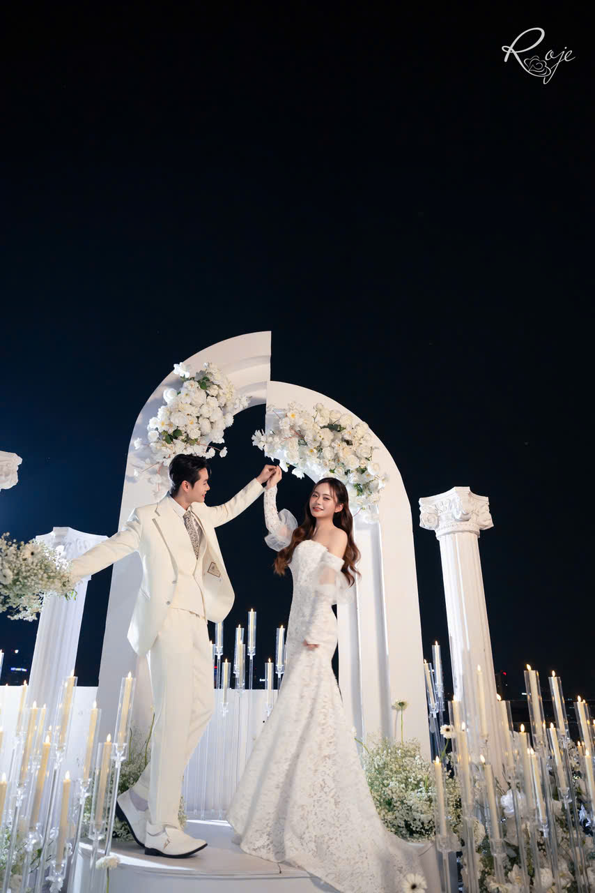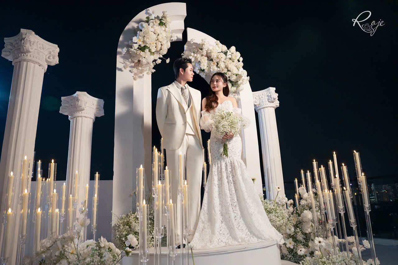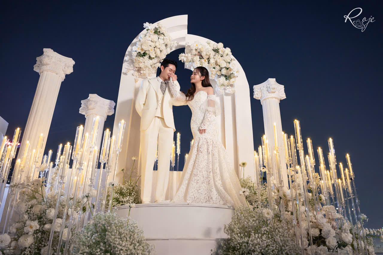 Ánh nến lung linh giữa không trung, background đêm sâu thẳm, hoa trắng tinh khôi và tình yêu của đôi mình