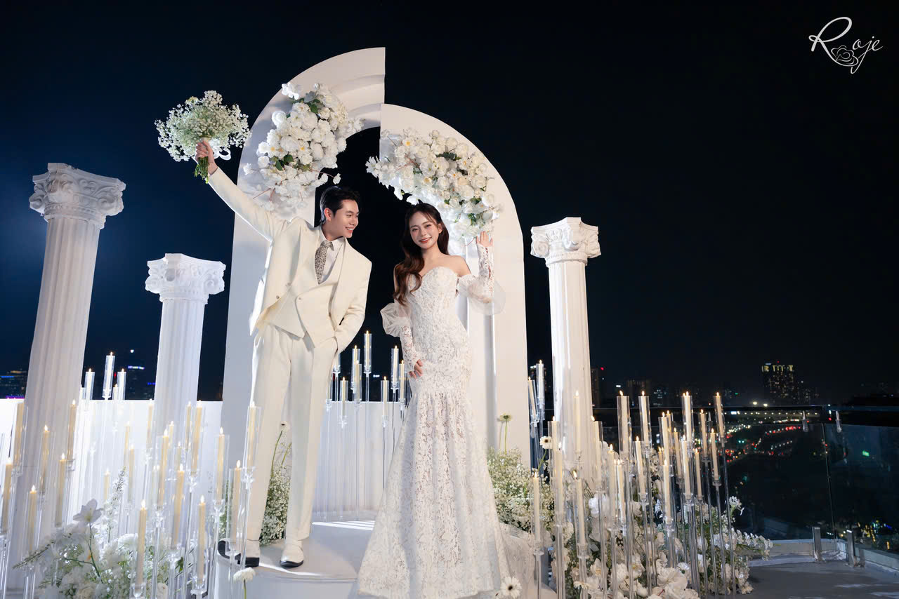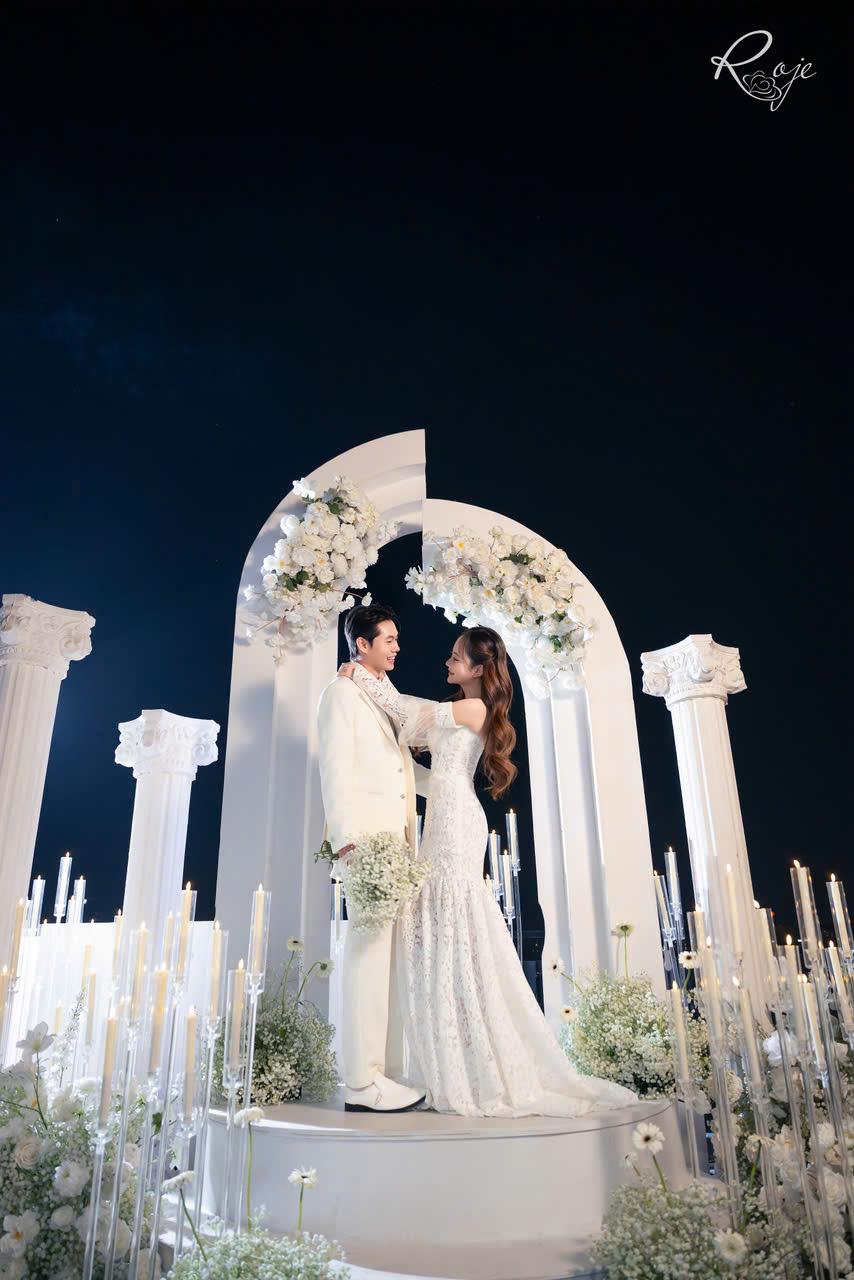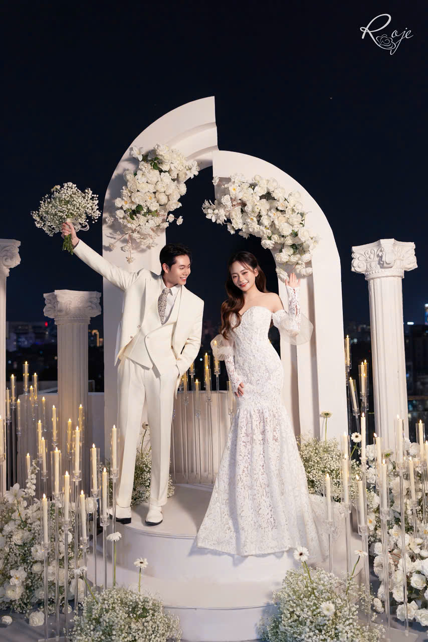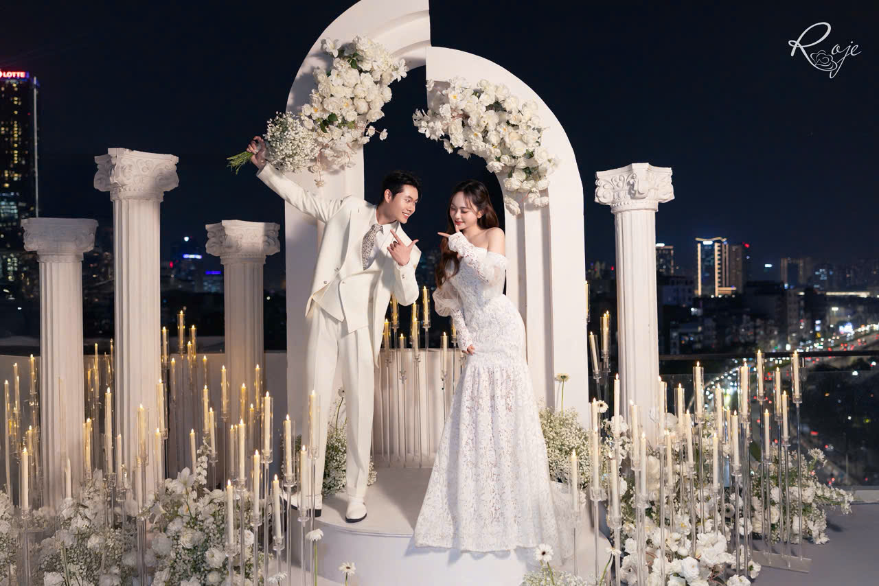 Ánh nến lung linh giữa không trung, background đêm sâu thẳm, hoa trắng tinh khôi và tình yêu của đôi mình