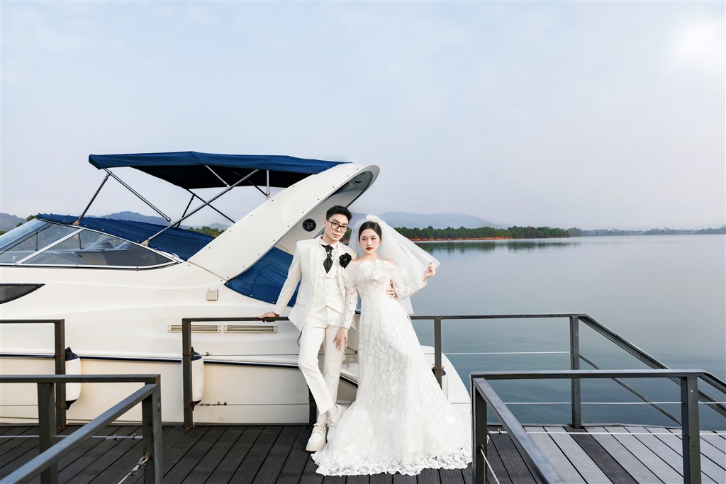 Concept chụp cưới tại hồ Đại Lải có thuyền là sự kết hợp giữa vẻ đẹp lãng mạn, tự do và một chút mộng mơ – như thể bạn đang sống giữa một thước phim tình yêu ngọt ngào giữa thiên nhiên.