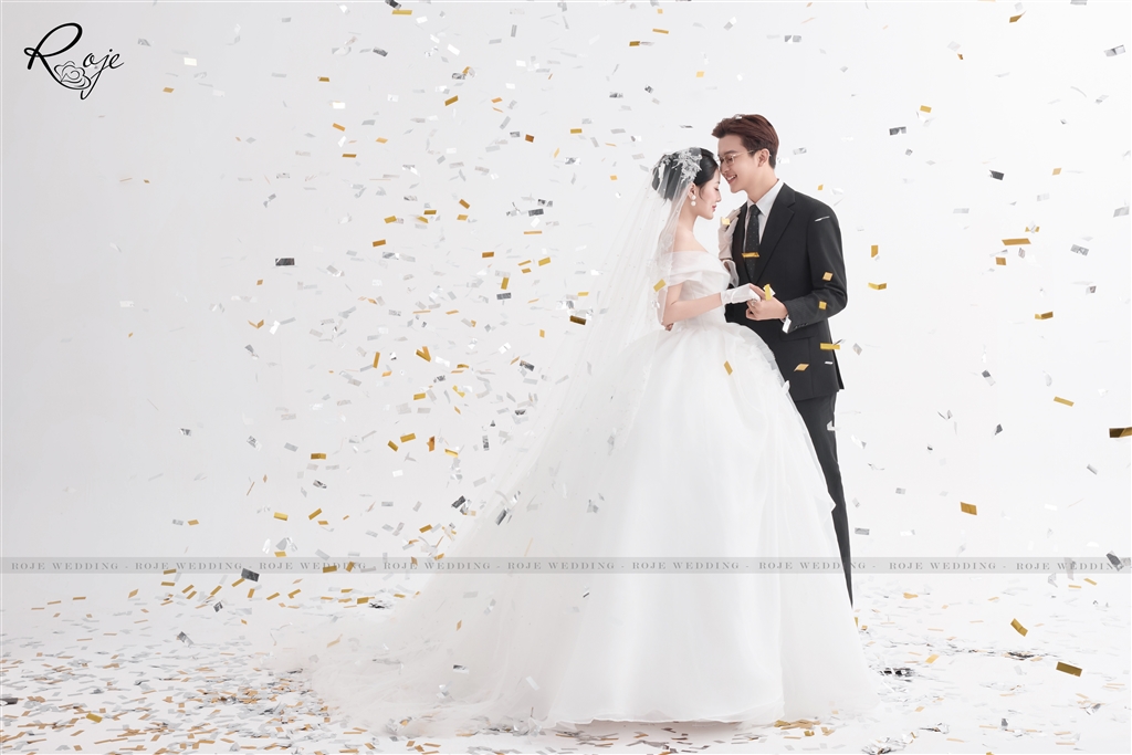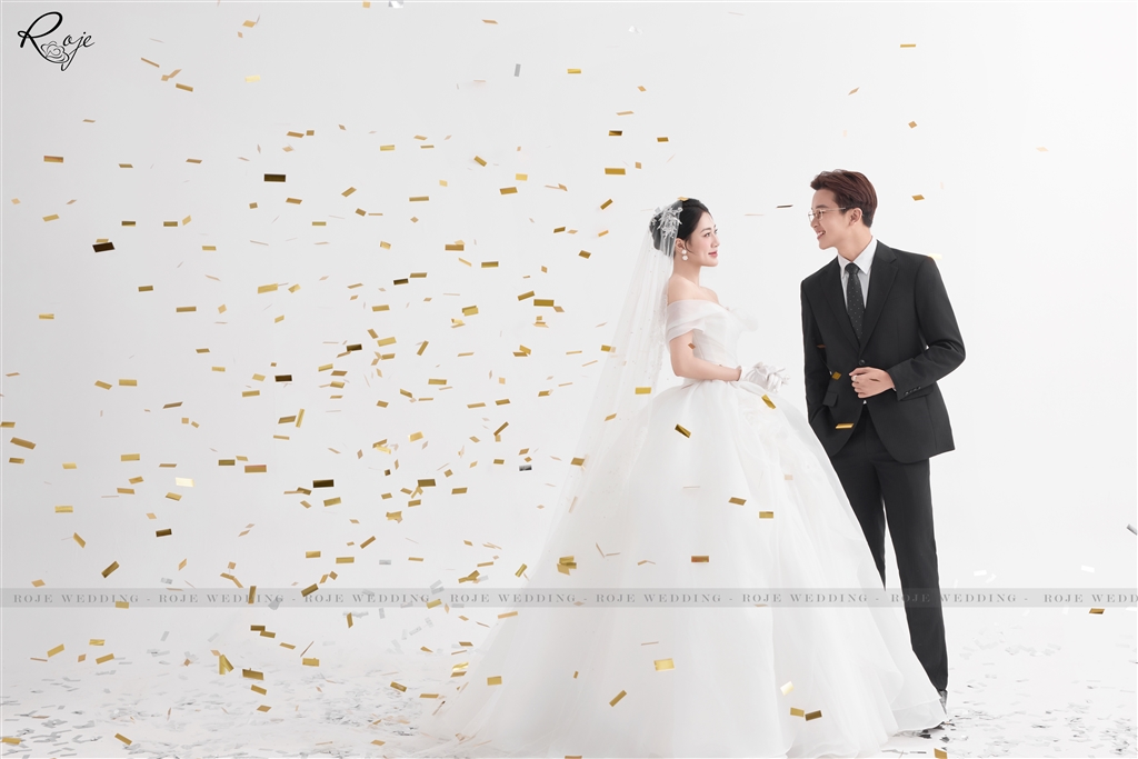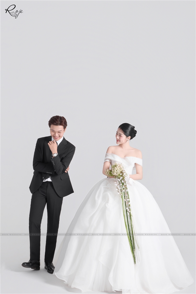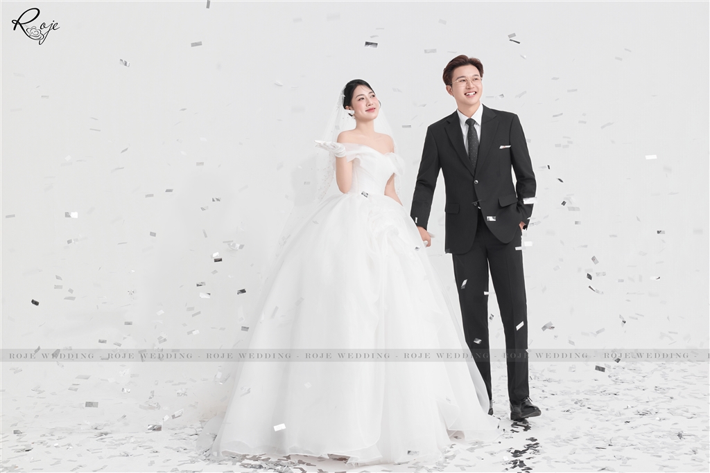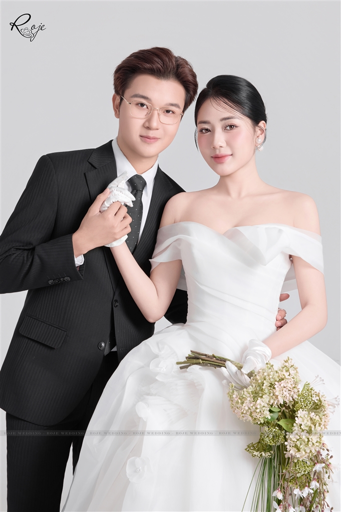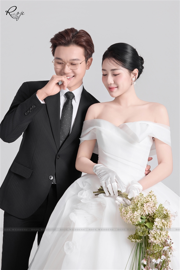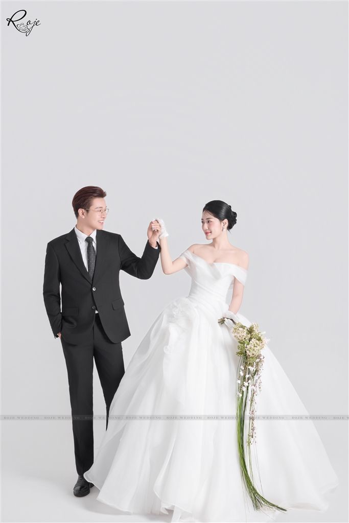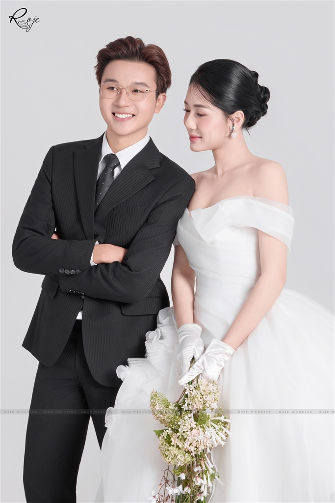 • Phông nền trắng tinh khôi giúp cô dâu chú rể trở thành “nhân vật chính tuyệt đối” trong khung hình, mỗi ánh nhìn – nụ cười – cái nắm tay đều trở nên nổi bật.